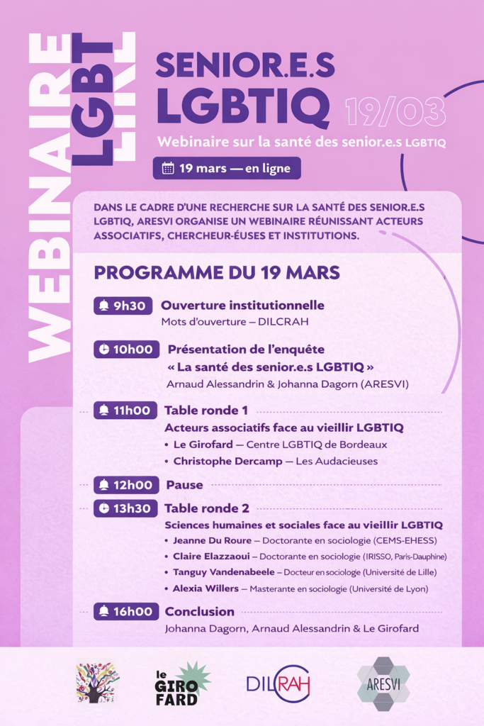 Avec la participation du centre LGBTIQ de Bordeaux, l’association ARESVI dévoile les résultats de son enquête sur les seniors LGBT le 19 mars lors d’un webinaire. Des publications et médiations accompagneront cette démarche soutenue par la DILCRAH.